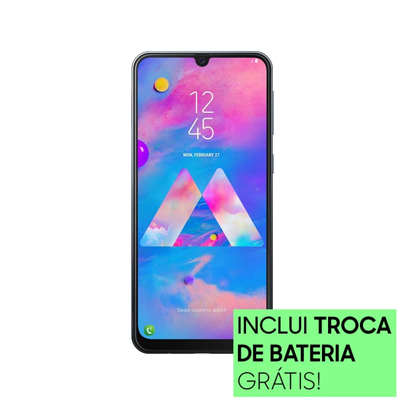 O Galaxy M30 conta com uma bateria de autonomia 5.000mAh, para você usar por muitas horas sem se preocupar! Além possui um display Super AMOLED com resolução 1080×2340 pixel, sendo possível verificar até os mínimos detalhes!